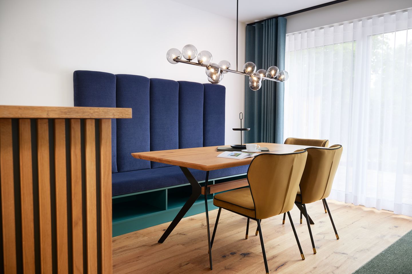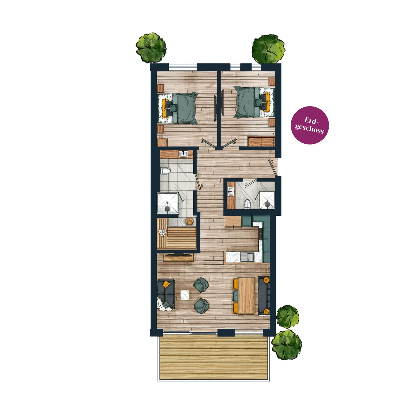 Der offene Grundriss des ca. 94 m² großen Apartments schafft ein großzügiges Wohngefühl. Der Wohn- und Essbereich mit integrierter Küche und Design-Polstermöbeln lädt zum entspannten Zusammensein ein und grenzt direkt an Ihre private Sonnenterrasse. Ein Highlight ist die hochwertige Küche mit türkisfarbenen Fronten und goldenen Armaturen – stilvoll und maritim. Zwei Schlafzimmer mit bequemen Boxspringbetten bieten Platz für vier Gäste. Besonders komfortabel: zwei moderne Badezimmer mit begehbarer Dusche, eines davon mit eigener Holzsauna.