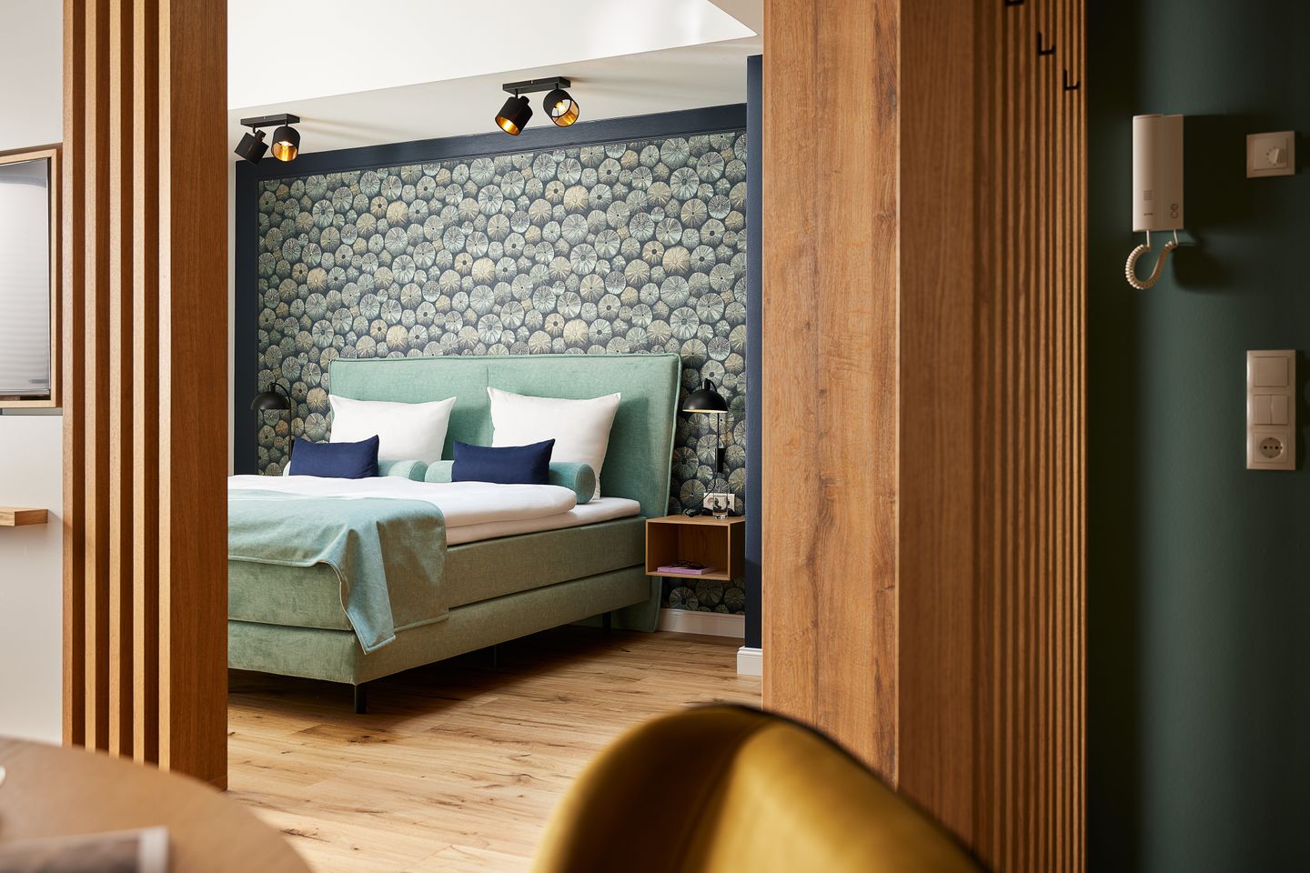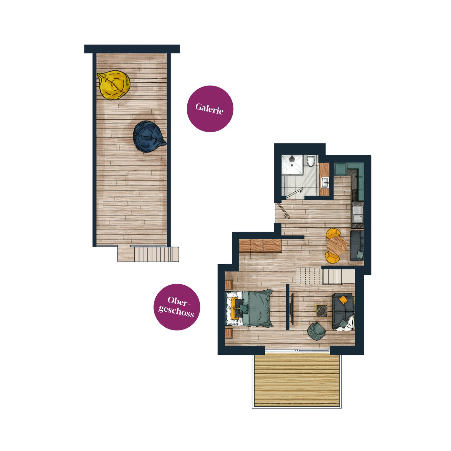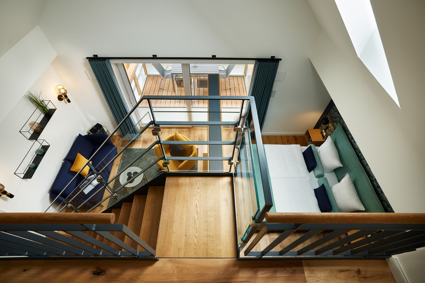 Die offene Konzeption des ca. 68 m² großen 1-Zimmer-Apartments schafft ein einzigartiges Wohngefühl und bietet Platz für bis zu zwei Gäste. Der Schlafbereich ist durch eine Trennwand geschickt vom Wohnbereich separiert. Hier genießen Sie ein hochwertiges Boxspring-Doppelbett. Der Wohn- und Essbereich mit integrierter Küche und Design-Polstermöbeln lädt zum gemütlichen Zusammensein ein und grenzt direkt an Ihren privaten Sonnenbalkon. Nicht nur die hochwertige Küche mit türkisfarbenen Fronten und goldenen Armaturen ist ein Highlight: Über dem Wohnraum befindet sich eine große Galerie, die zum Entspannen einlädt. Auch ein modernes Badezimmer mit ebenerdiger Dusche gehört zur elegant-maritimen Ausstattung.