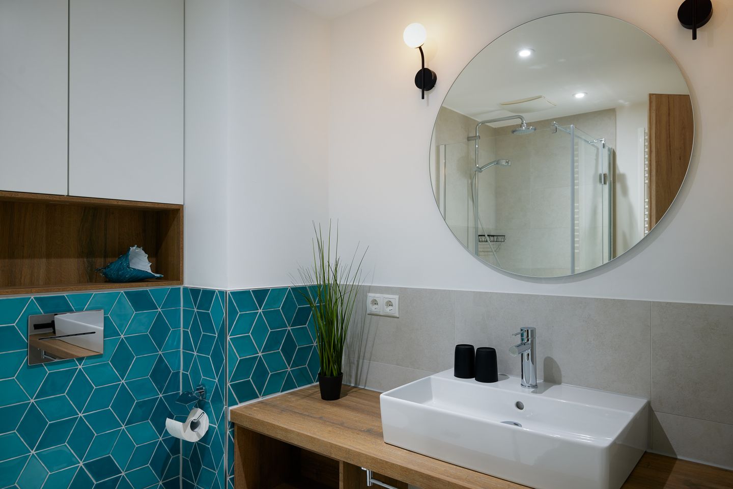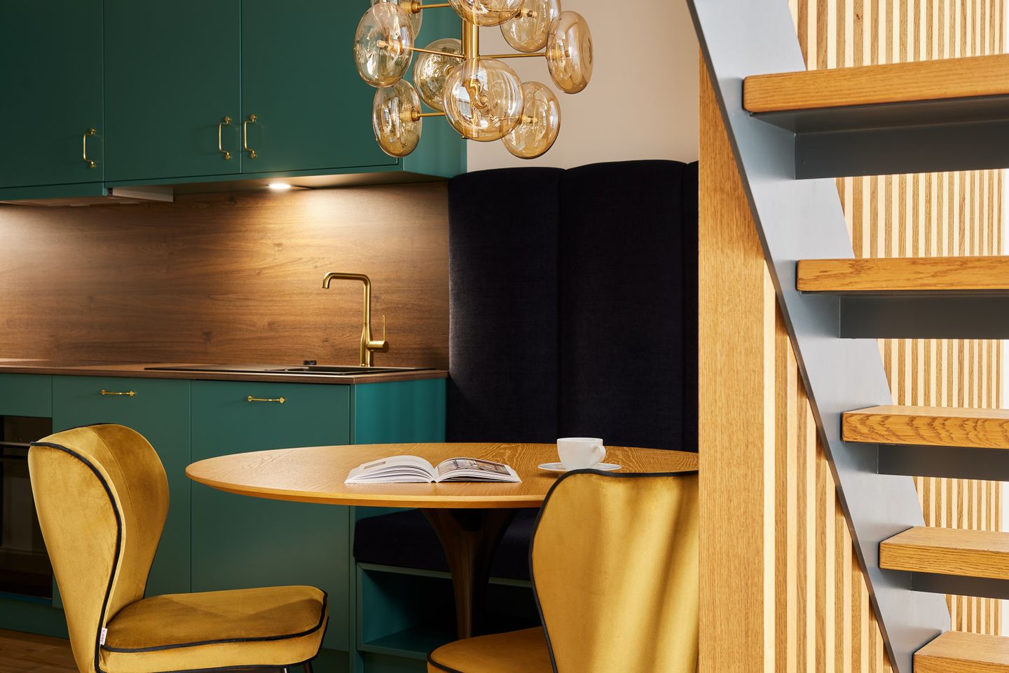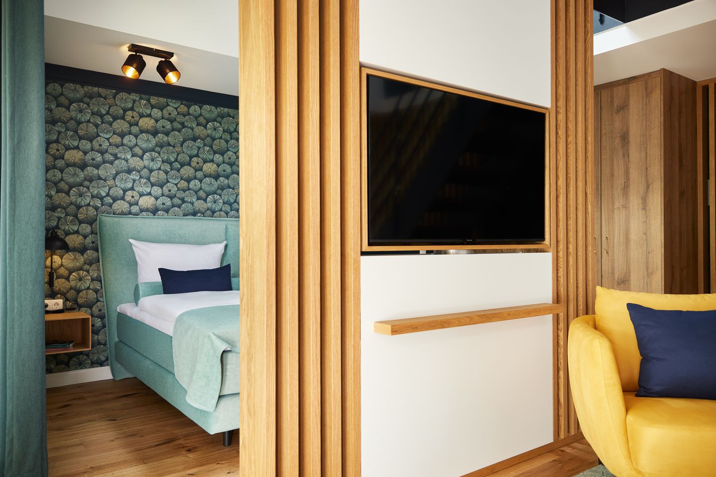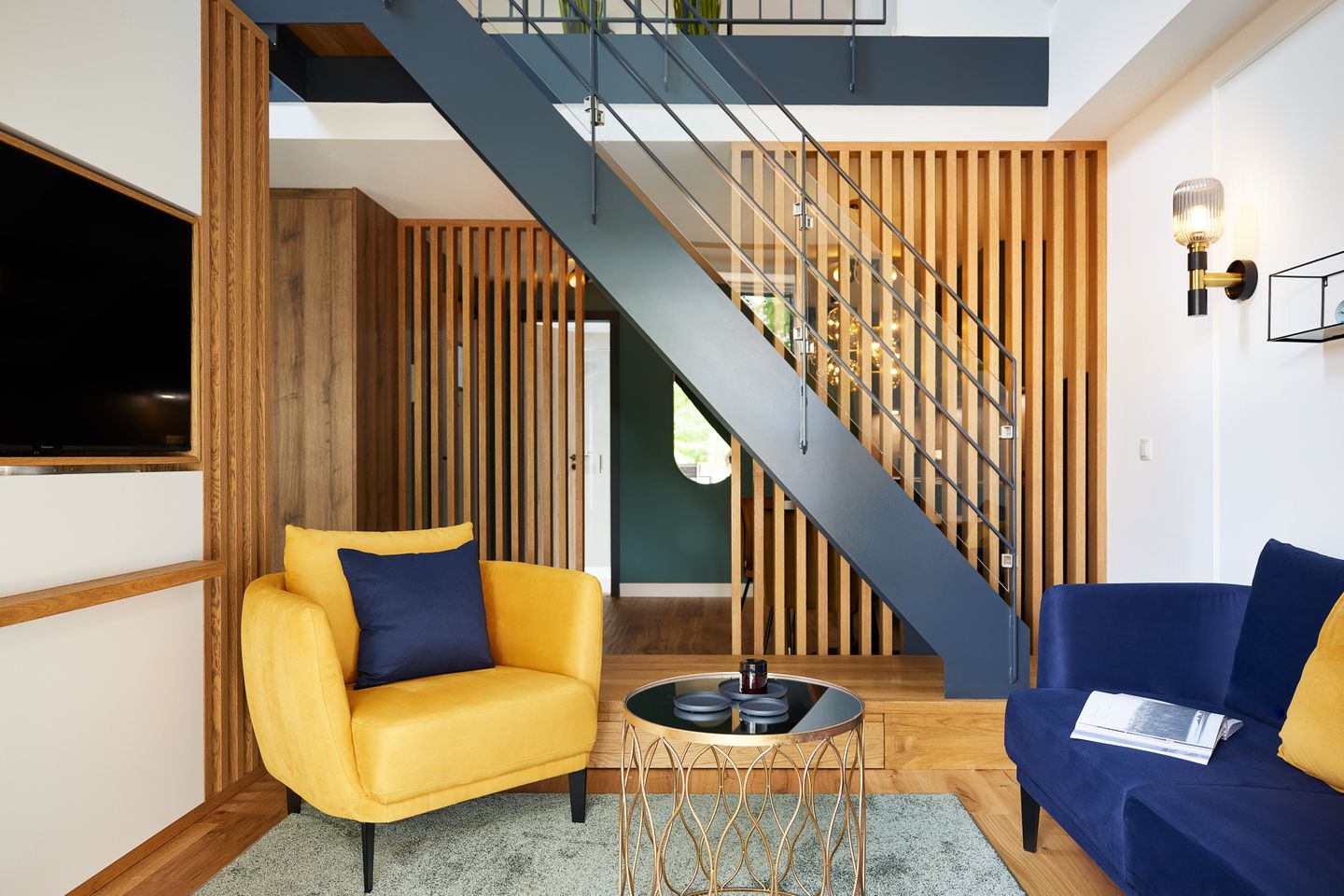 Die offene Konzeption des ca. 68 m² großen 1-Zimmer-Apartments schafft ein einzigartiges Wohngefühl und bietet Platz für bis zu zwei Gäste. Der Schlafbereich ist durch eine Trennwand geschickt vom Wohnbereich separiert. Hier genießen Sie ein hochwertiges Boxspring-Doppelbett. Der Wohn- und Essbereich mit integrierter Küche und Design-Polstermöbeln lädt zum gemütlichen Zusammensein ein und grenzt direkt an Ihren privaten Sonnenbalkon. Nicht nur die hochwertige Küche mit türkisfarbenen Fronten und goldenen Armaturen ist ein Highlight: Über dem Wohnraum befindet sich eine große Galerie, die zum Entspannen einlädt. Auch ein modernes Badezimmer mit ebenerdiger Dusche gehört zur elegant-maritimen Ausstattung.