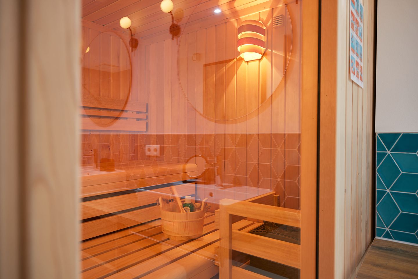 Im hellen Obergeschoss befindet sich ein großes Schlafzimmer mit komfortablen Doppelbett mit eigenem Balkon sowie ein geräumiges Badezimmer. Für erholsame Stunden sorgt Ihr privater Wellnessbereich mit Sauna und Bad im Untergeschoss. Es besteht eine weitere Schlafmöglichkeit für bis zu 2 Personen. In einem separaten Raum stehen zusätzlich eine Waschmaschine und ein Trockner zur Verfügung.