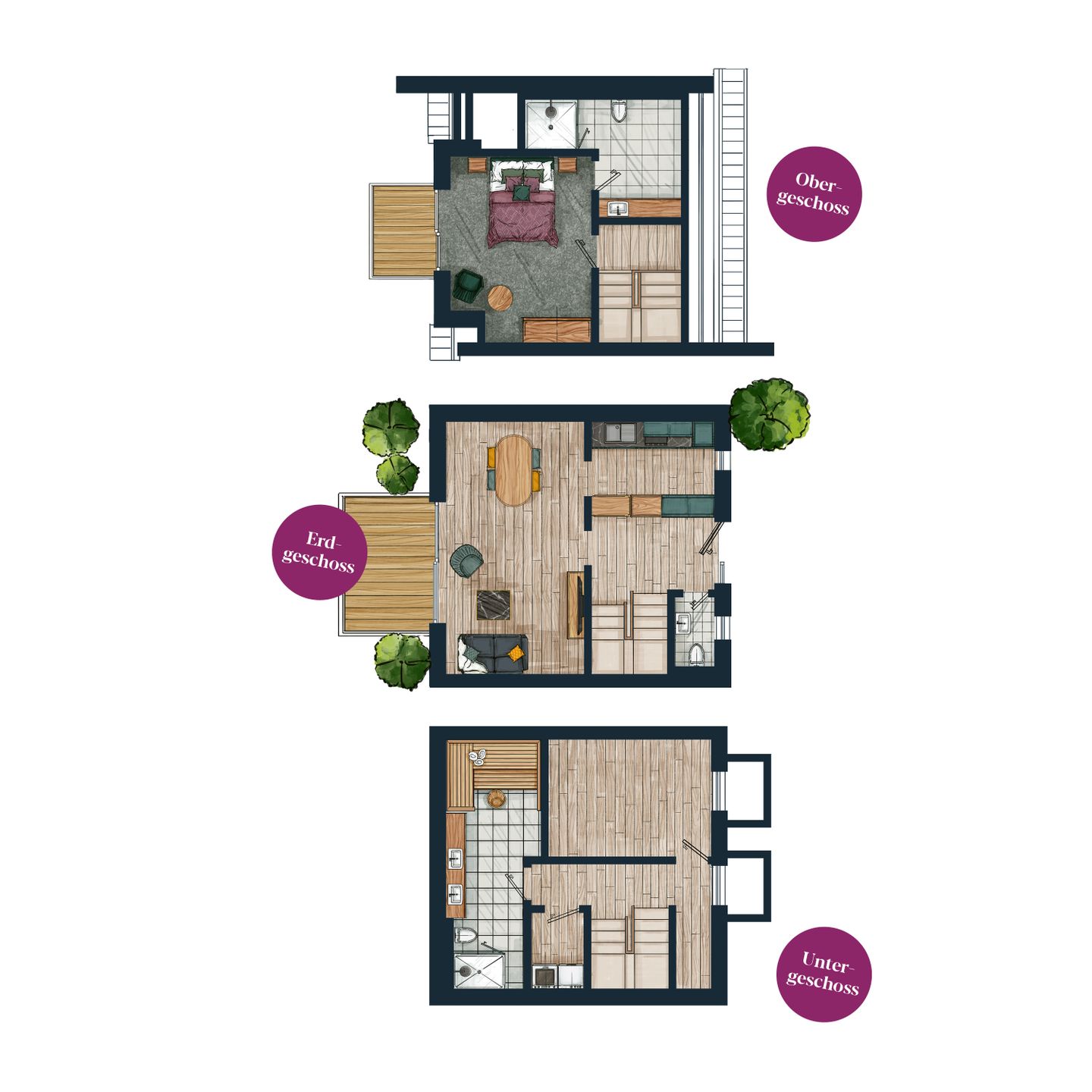 Im hellen Obergeschoss befindet sich ein großes Schlafzimmer mit komfortablen Doppelbett mit eigenem Balkon sowie ein geräumiges Badezimmer. Für erholsame Stunden sorgt Ihr privater Wellnessbereich mit Sauna und Bad im Untergeschoss. Es besteht eine weitere Schlafmöglichkeit für bis zu 2 Personen. In einem separaten Raum stehen zusätzlich eine Waschmaschine und ein Trockner zur Verfügung.